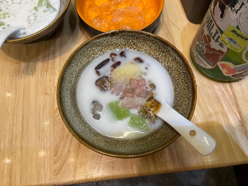I ended up having a bowl with: Red Beans, Mung Beans, Taro, Pomelo, Pandan Jelly, Beetroot Jelly, Banana, Rice Jelly, Sweet Noodles.