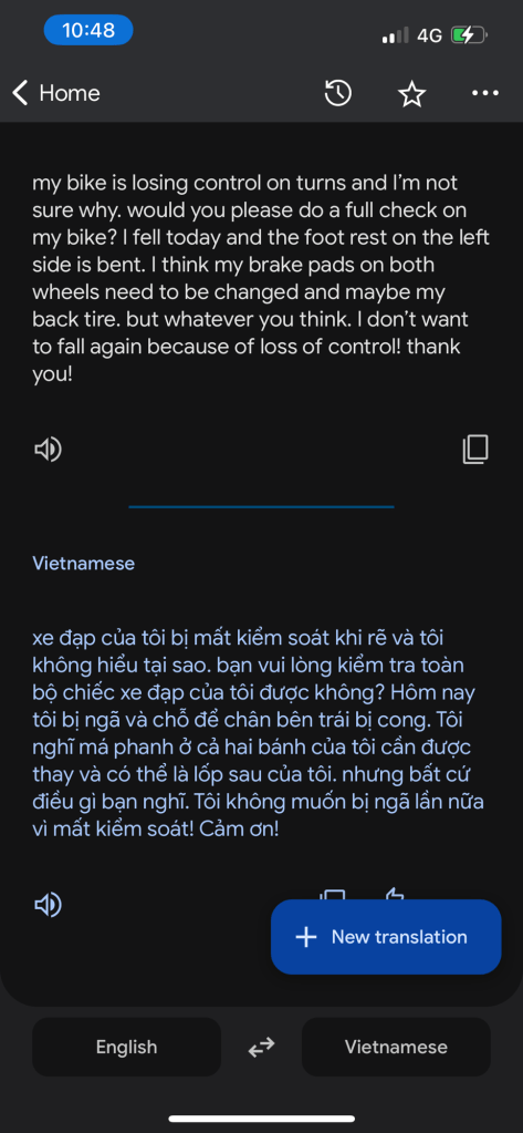 320,000 Dong later, he replaced the wheel and tightened up the back brake and the bike instantly felt so much better.