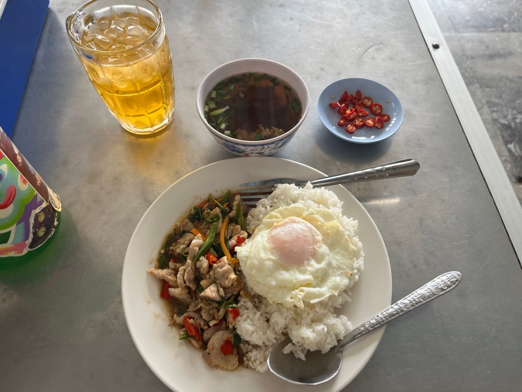 Less than an hour later I rolled into Pakse and found a place to escape the heat and eat some food! I took a wrong turn trying to find this restaurant and ended up in a very busy market that the traffic was at a dead halt. Once I got through that, I sat down and ate a very yummy meal of beef, rice, and a fried egg!