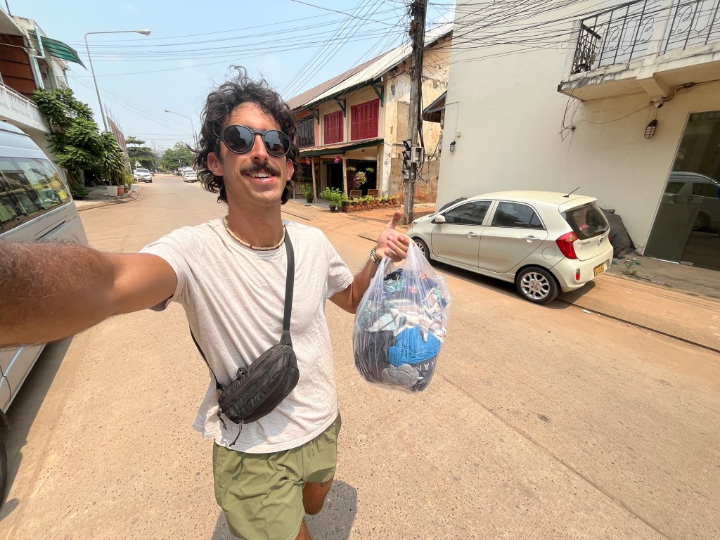 I thoroughly enjoyed this meal and ate until I couldn’t eat any more. I then paid and walked back over to see if my laundry was now done and it was! So I paid 40,000 Kip ($2) and headed back to the hostel to pack it up!