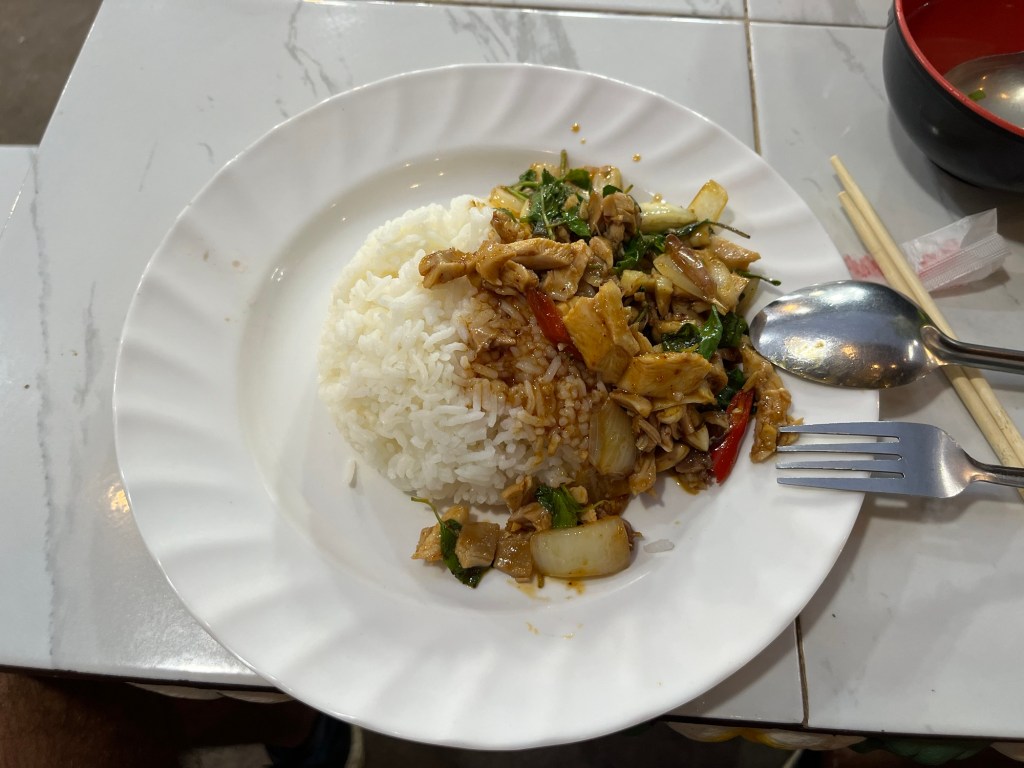 I started my evening of eating with a 35,000 Kip meal of chicken and basil, one of my favorite dishes from Thailand! I guess since we’re so close to the border the dishes seep over.