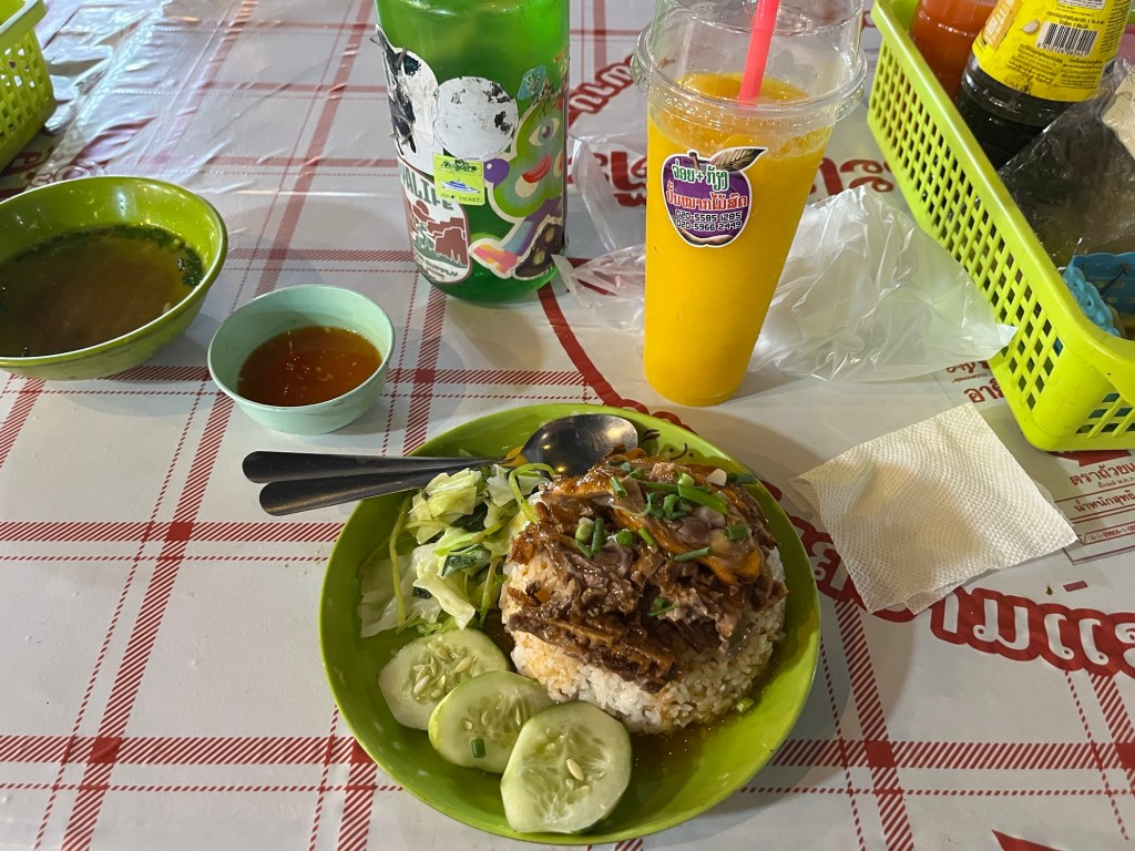 I still was hungry so I grabbed a mango smoothie for 25,000 Kip and duck with rice for 35,000 Kip. This totaled the evening of eating to around $4 for a lot of food! Since I skipped breakfast I was okay with splurging a little.