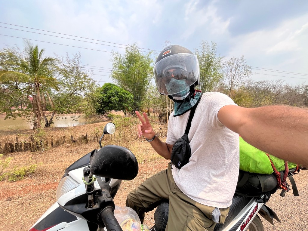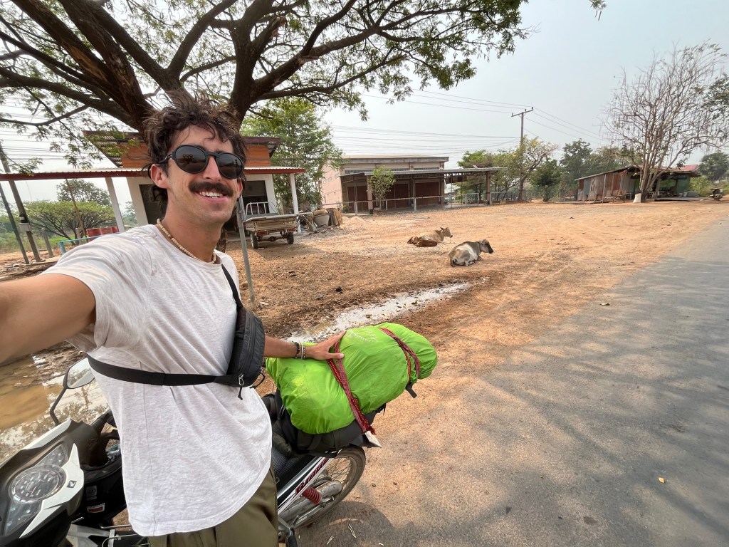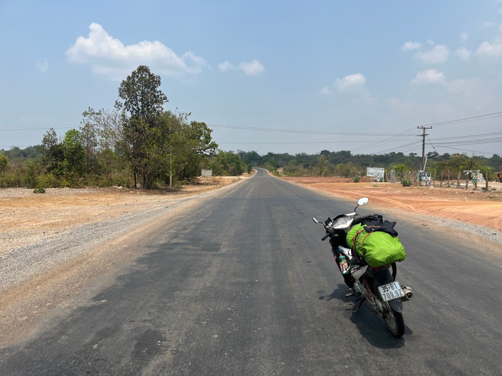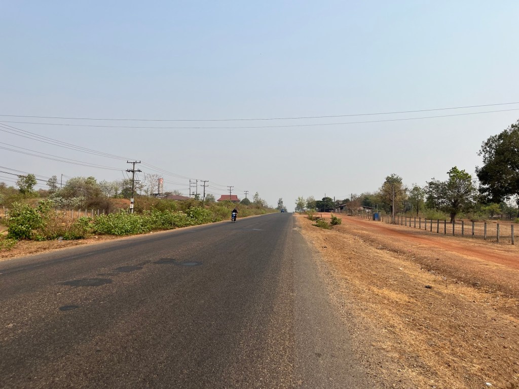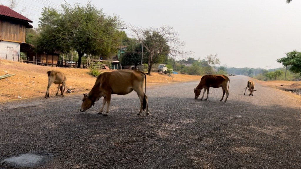Riding in Laos is much different than riding in Vietnam. First off the roads are filled with bumps, potholes, and dust. Second off, the scenery is a lot different! The south so far has been very flat and very dry. All the fields are barren and there’s a ton of cattle, goats, dogs, and chickens roaming around. So I’m having to stay very alert.
