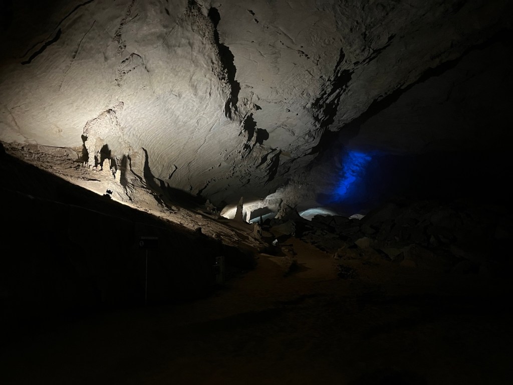 The cave started out by leading you right up along an underground stream, which was a gorgeous shade of blue! The ceiling quickly became low and I had to crouch my way for a couple of minutes as I headed further into the cave… it actually was a little claustrophobic for me!