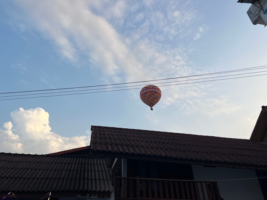 Out of no where, a hot air balloon started to fly overhead! Vang Vieng is known for its cheap hot air balloon sunset and sunrise journeys and there’s a chance I do it or something similar before my time here is up! It looked VERY cool!