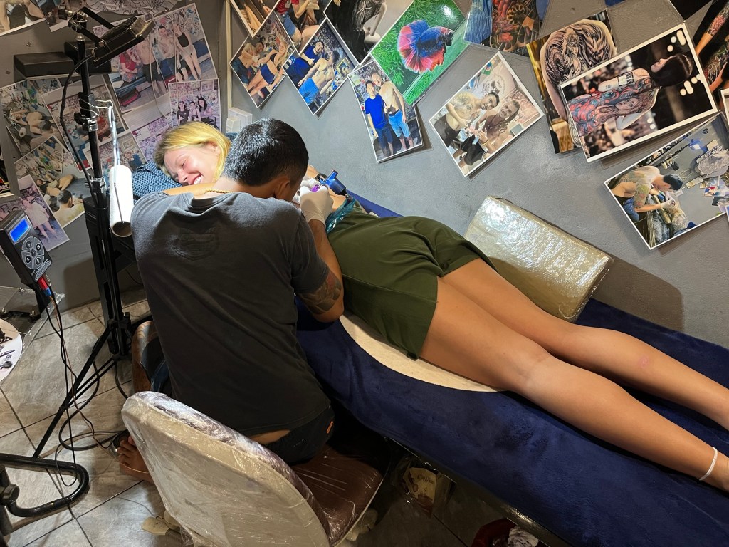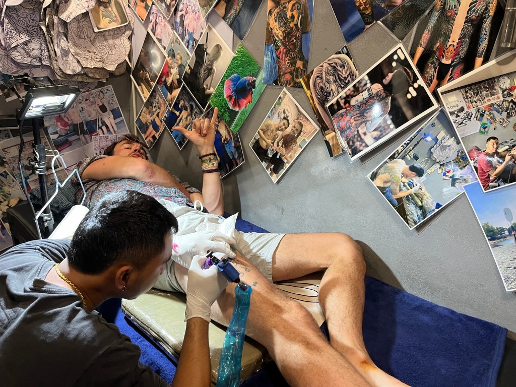 Sabai Sabai means: Happy happy, I’m feeling good, or take it easy. It’s a very common response to how are you in the countries out here! I thought that was a super fun and spontaneous tattoo idea and decided to join them for the memory of getting a tattoo with new and old friends in a wonderful town and country!