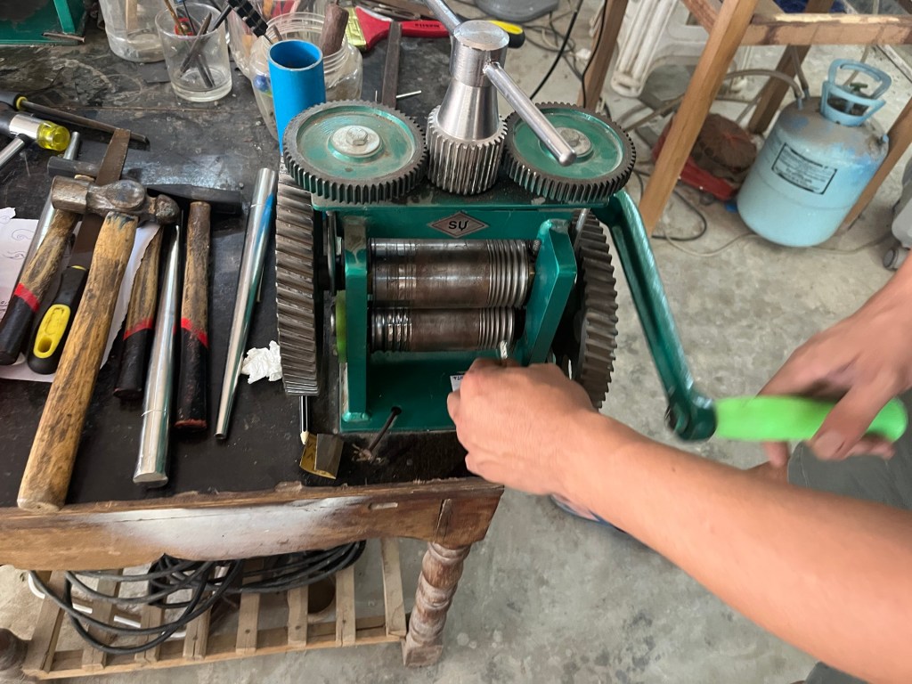After pounding away with a hammer, you put the silver through a pressing device that stretches out the material to your desired band thickness and length.