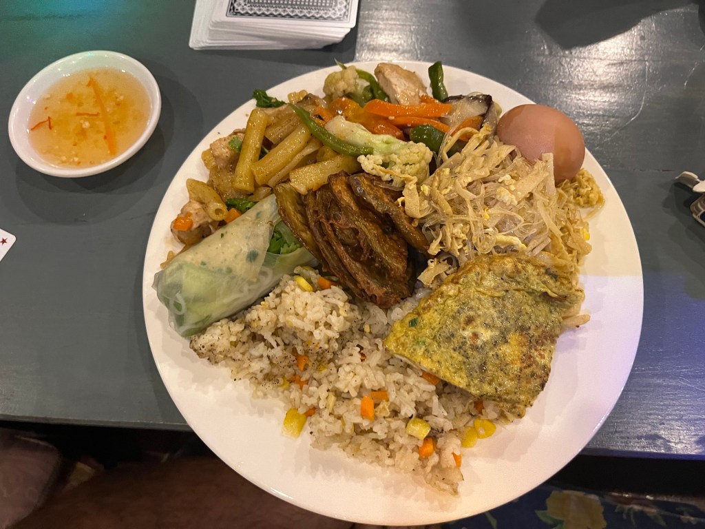 I stuffed myself silly and it felt like I was at thanksgiving dinner in SE Asia! There was fried rice, spring rolls, chicken with thick rice noodles, tofu and vegetables, thinner rice noodles, fried eggplant, and eggs!