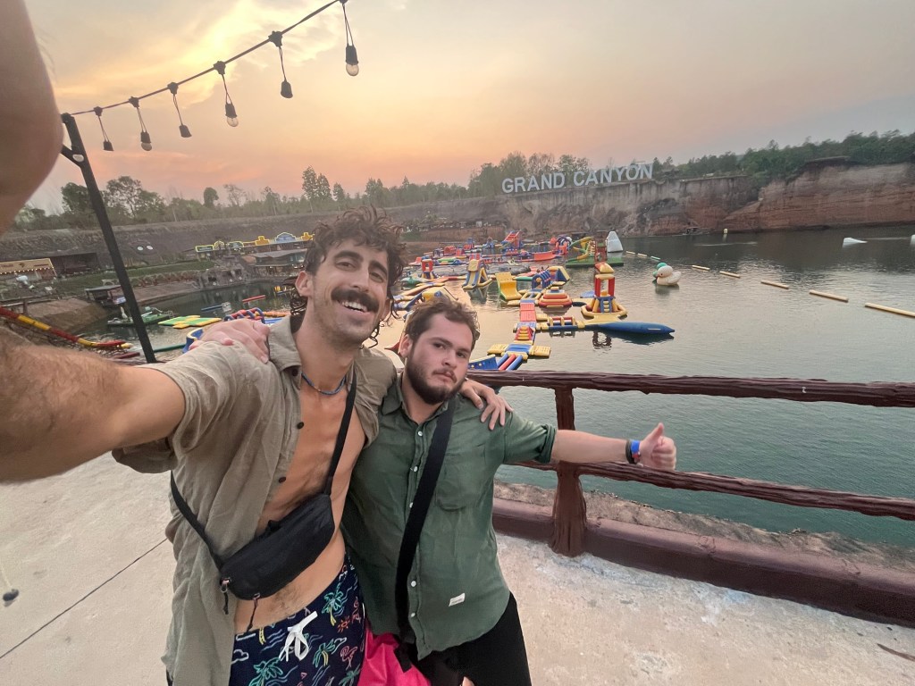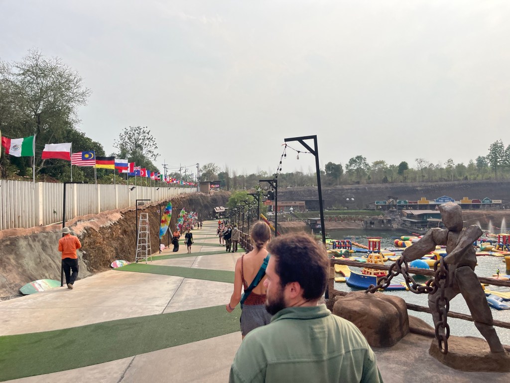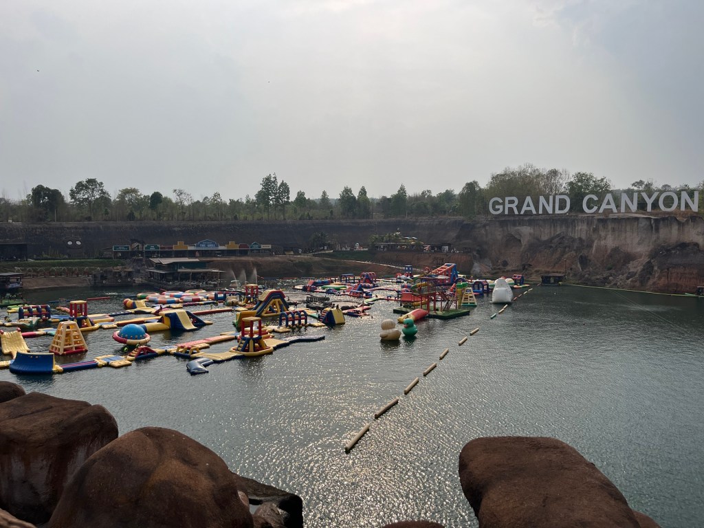 We arrived at, what looked like, a giant quarry that had been filled with water… but on top of the water was a mega inflatable water park!