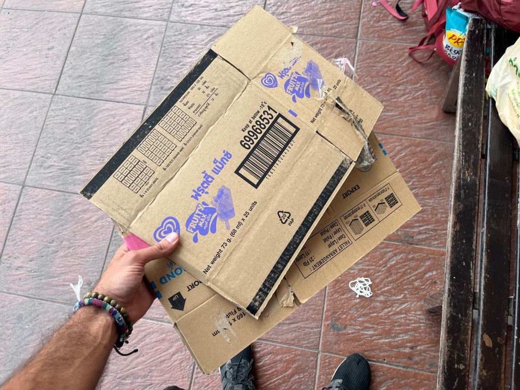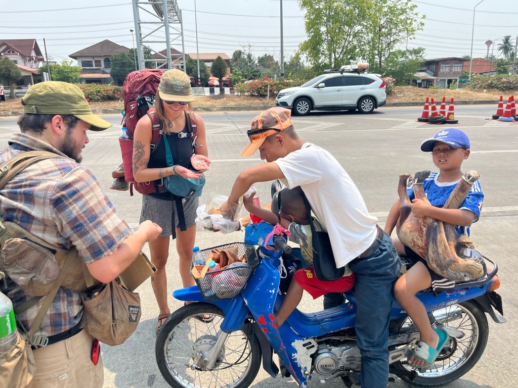 5 minutes of trying to get a ride, a Thai local and his kids pulled up to us and gave us a pineapple and some ramen. We thanked him profusely and tried to give it back but he wouldn’t take it (eventually we snuck the ramen back into his bike). He then went on to give us plastic beads and stones and then asked us for 100 Baht… it went from being a very nice and kind gesture to being a strange and uncomfortable situation.