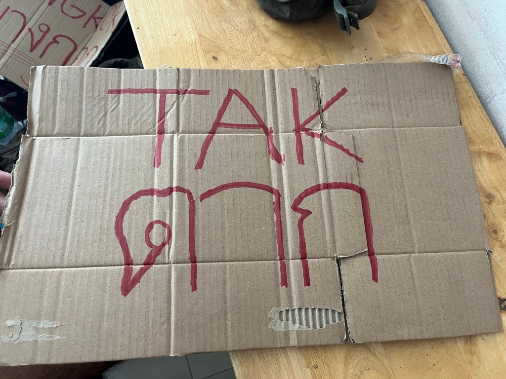 I also made a new sign while at the cafe saying: TAK/ตาก, this is a city south of where we were and on the way to Bangkok.