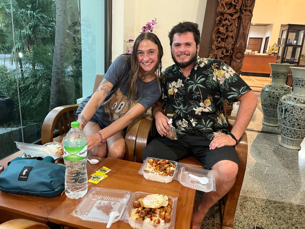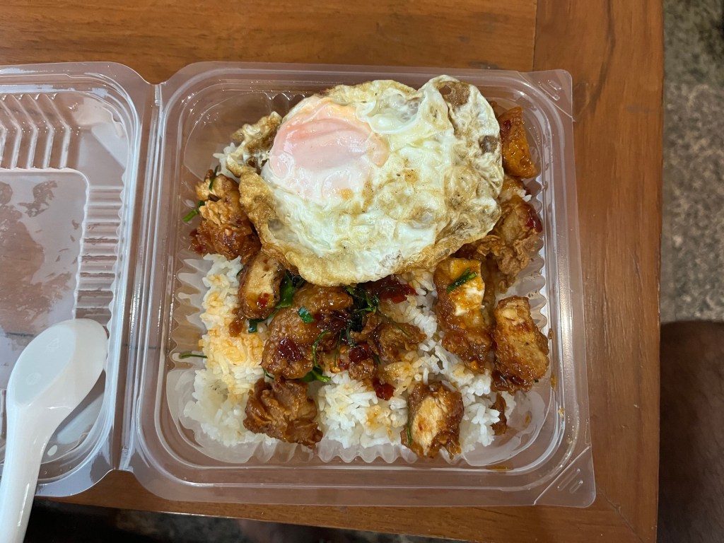 We checked in and plopped down on our beds. We were all starving but had no desire to go out again. So we ordered food through the Grab app and ended up getting an insanely good meal for super cheap! I paid 66 Baht for a huge portion of curry fried chicken with rice and an egg.