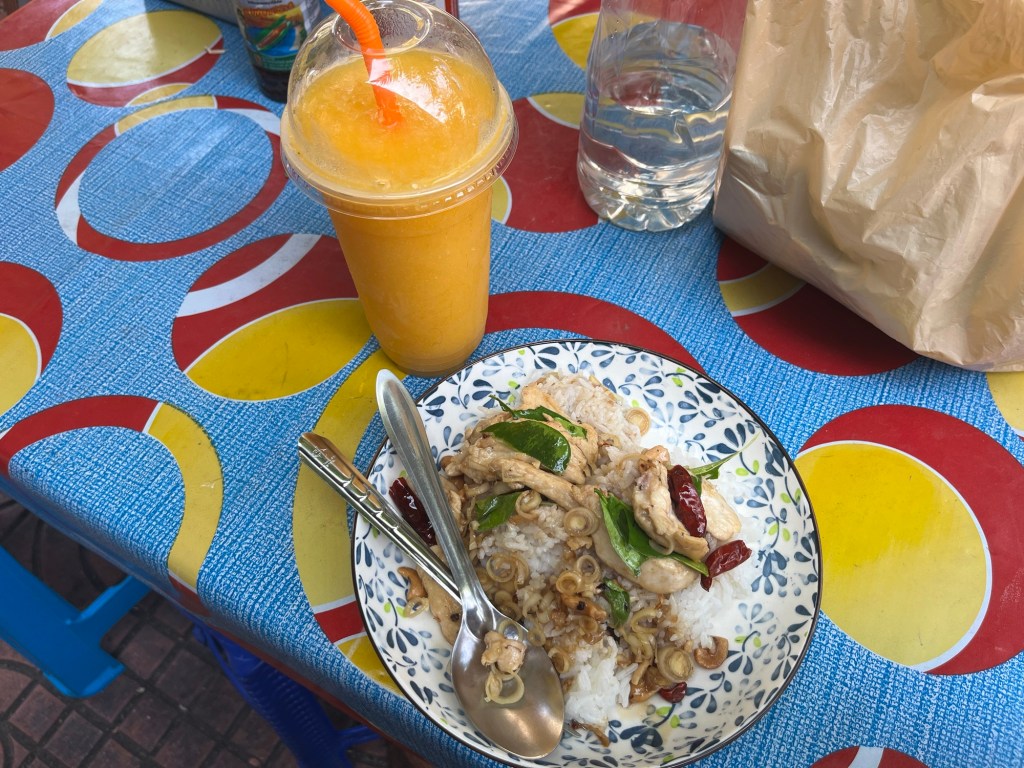 I enjoyed a large mango smoothie for 45 Baht and a delicious plate of stir fried chicken with lemon grass, cashews, and rice for 50 Baht… under $3 for this meal.