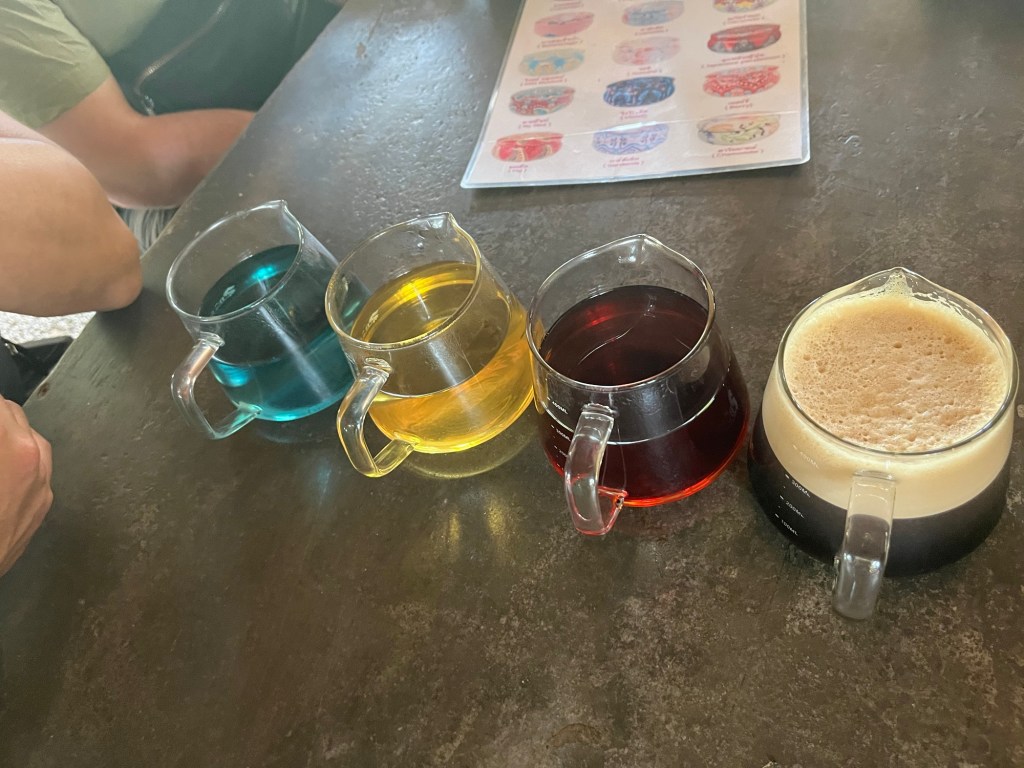The tea and coffee plantation had 4 different drinks for us to try! They were medium roast coffee, tea made from caffeine beans, a mixed flower tea, and a butterfly pea tea!