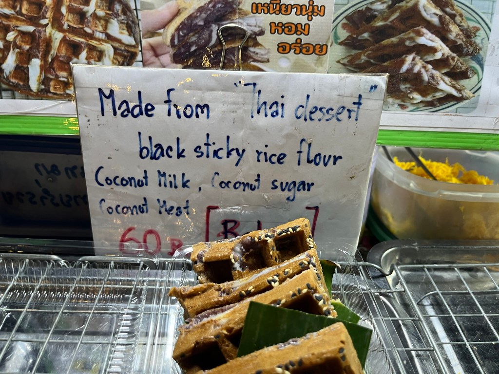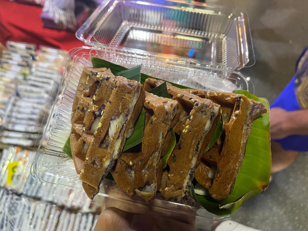 And then for desert, I got a waffle called Babin. Which is made out of black sticky rice, coconut milk, coconut sugar, and coconut meat. It was very good! We also got 10 Baht pieces of mochi where I got a mint chocolate chip flavored one!