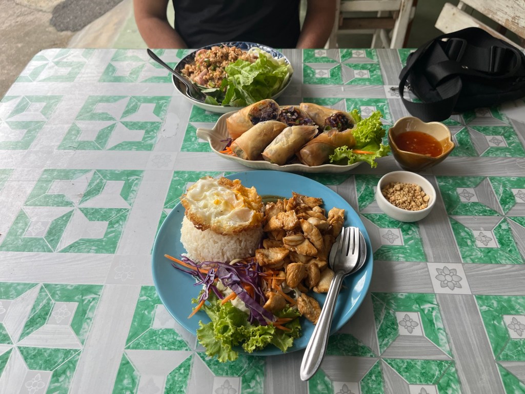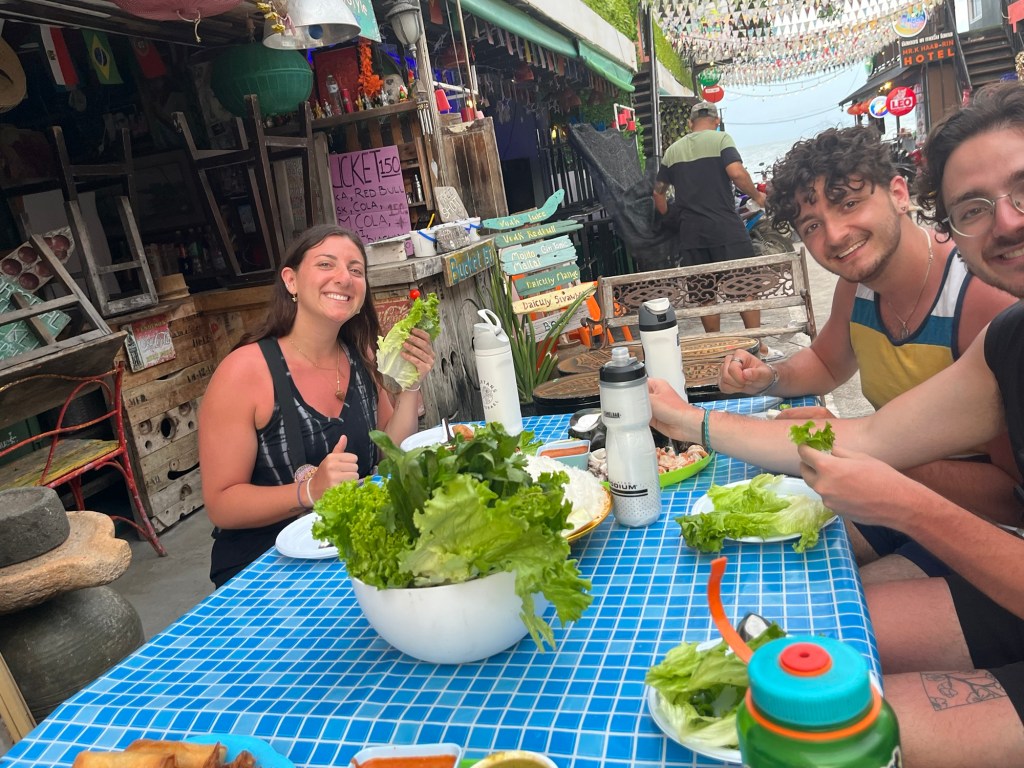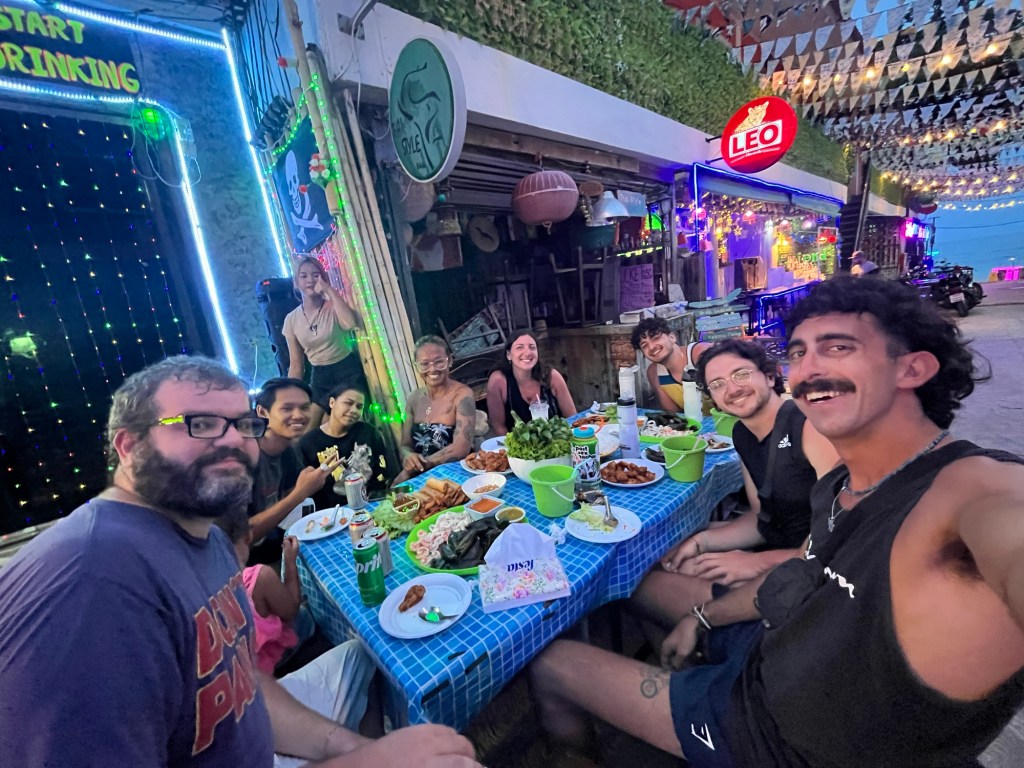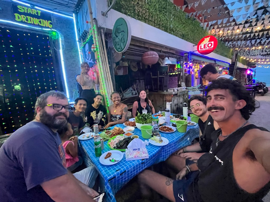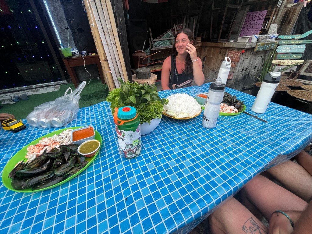 It was an absolute feast! Chira cooked us a ton of food. She made shrimp, fried chicken, oysters, vegi spring rolls, and squid. Along with some spicy sauces and lettuce wraps to go with it. And on top of that, Aaron wouldn’t let us pay for anything… so in exchange, we bought drinks from Chira’s shop all night.