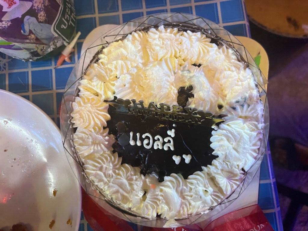 The cake even had my name on it in Thai! Also, it had been a while since I had had cake, and this one was pretty dang good!.