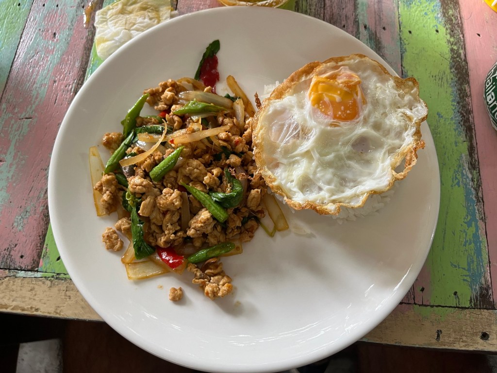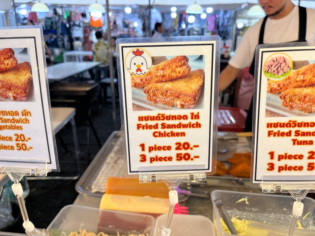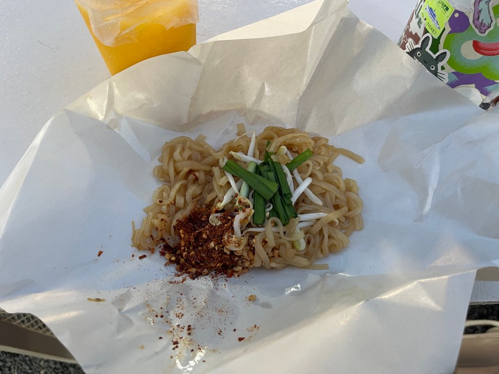 I got a Thai style chicken basil gyoza for 10 Baht. Then I got a fried chicken sandwich with chicken on the inside for 20 Baht. After, I got a mango smoothie for 30 Baht. And finally, I got a 20 Baht pad Thai, this was pretty small but for 20 Baht I couldn’t complain.