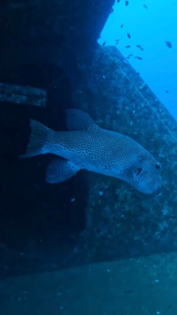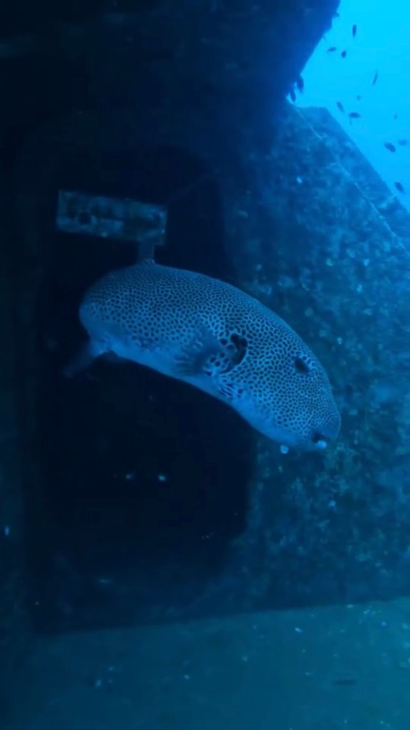 We also saw some ginormous fish hiding around the bottom of the wreck… and then, as we started to crest over the top of the wreck, we saw the giant puffer fish again!!
