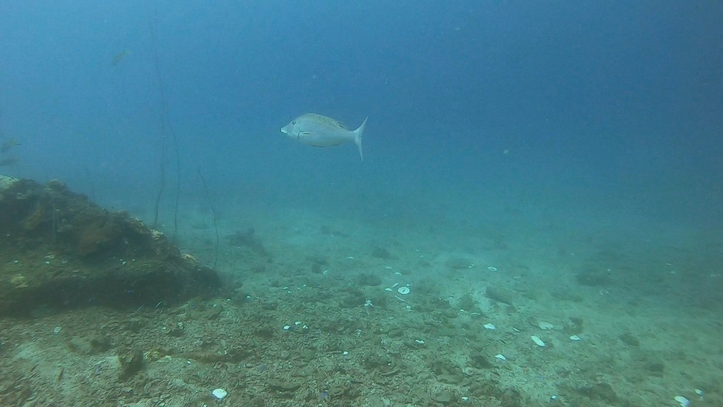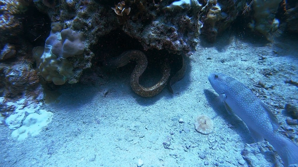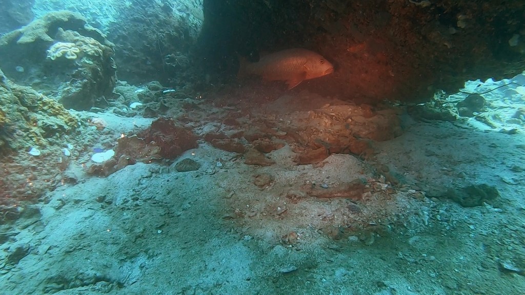We immediately saw a very large pufferfish with a remora on it and we saw some mega long face fish and some other huge fish that is a variety of the sweet lip fish. Later on in the dive I spotted a moray eel helping groupers hunt, it was super cool to watch it dive deep into the coral to force the fish out.