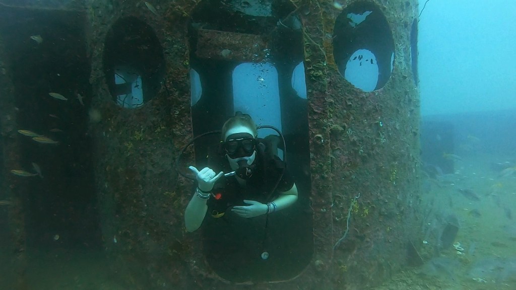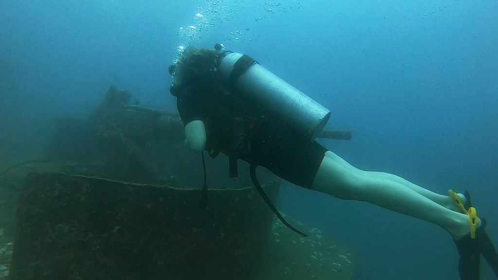 The visibility wasn’t the best as we descended down to the bottom of the shipwreck… so we didn’t spend too much time there. I brought us up slowly around the boat and we circled it for a bit before moving on to Hin Pee Wee.