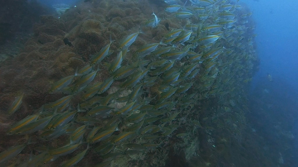 We unfortunately didn’t see a whale shark this time (I found out later, allegedly, one was spotted this morning when we weren’t there). We did however see a ginormous grouper, very large barracudas, and two giant schools of fusiliers.