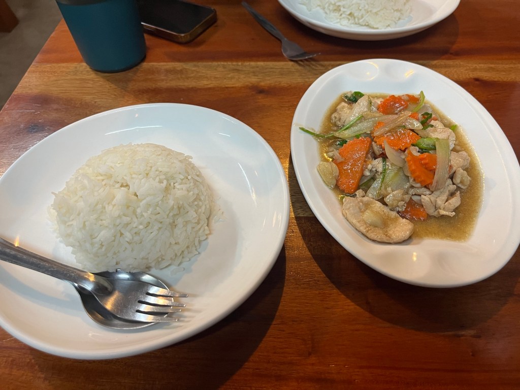 After the sunset, we made our way back across town to eat dinner together. The first restaurant we went to, a Khao Soi place, was closed. So we went to Blue Chair instead.