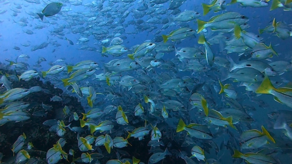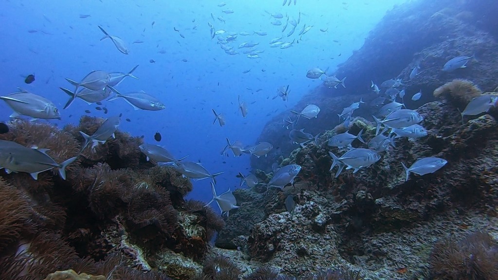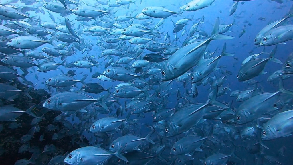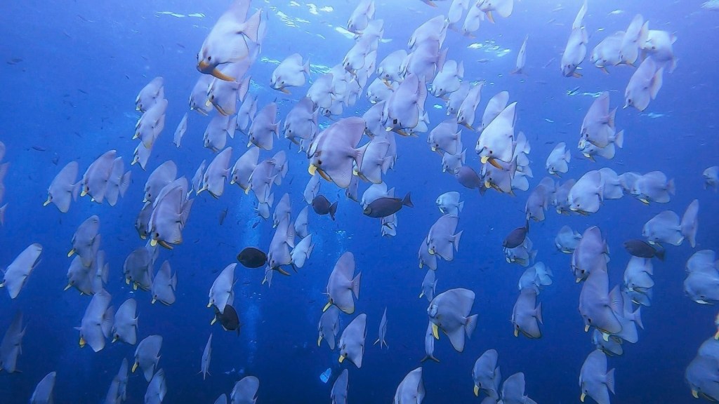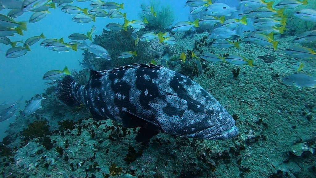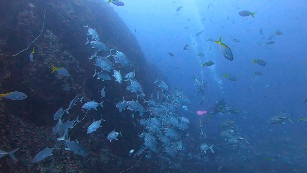 We swam into some huge schools of big eye travelly, oxyeye scad, and stumbled onto one of the largest groupers I’ve ever seen!