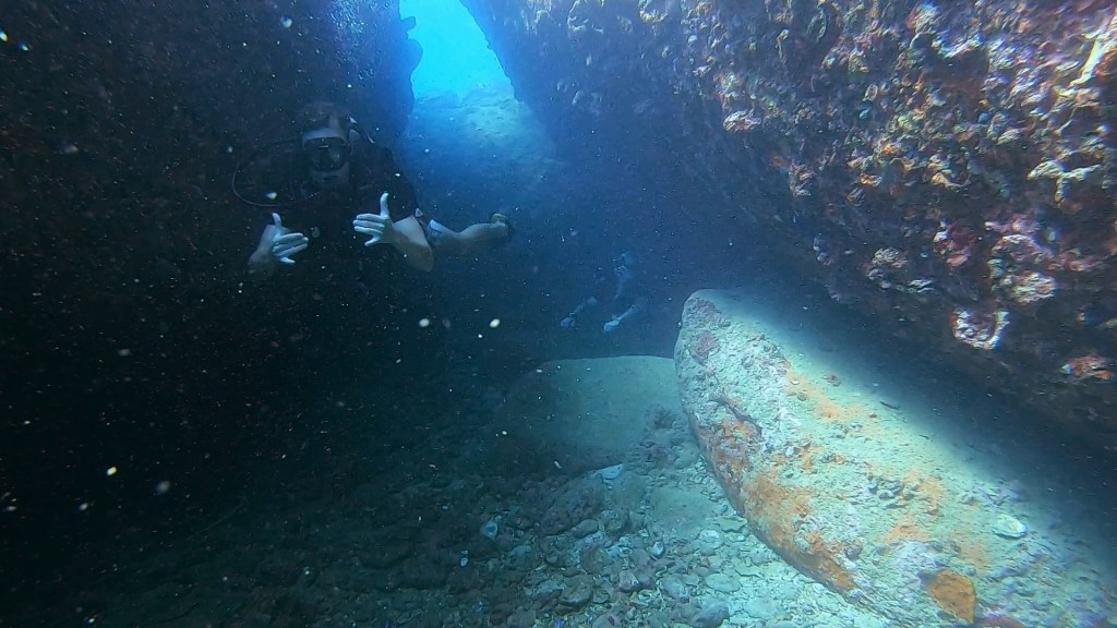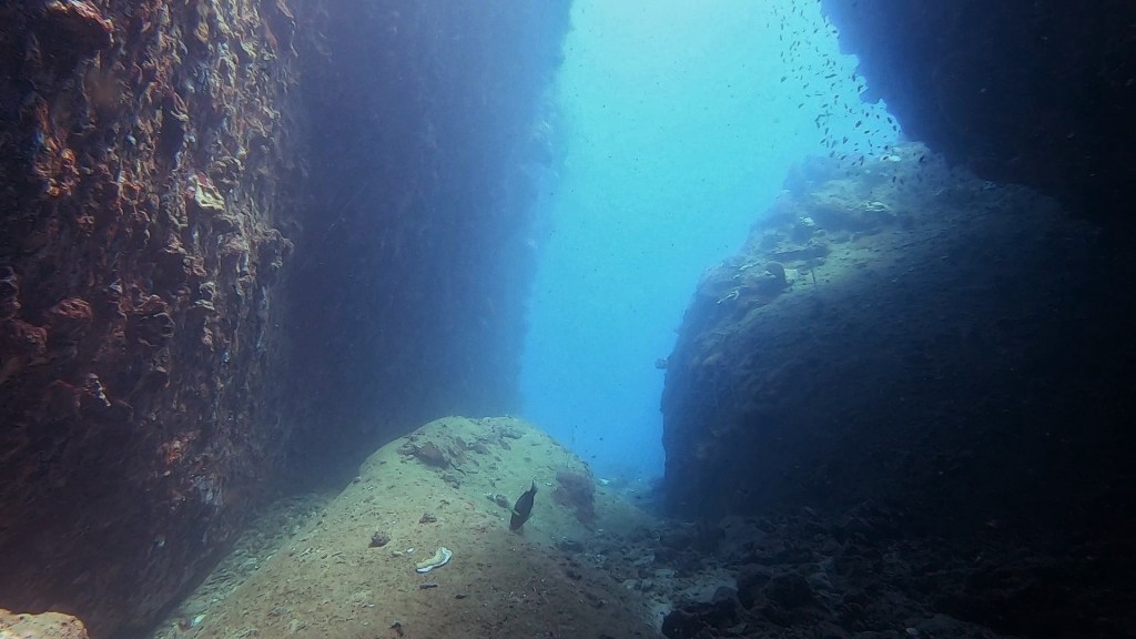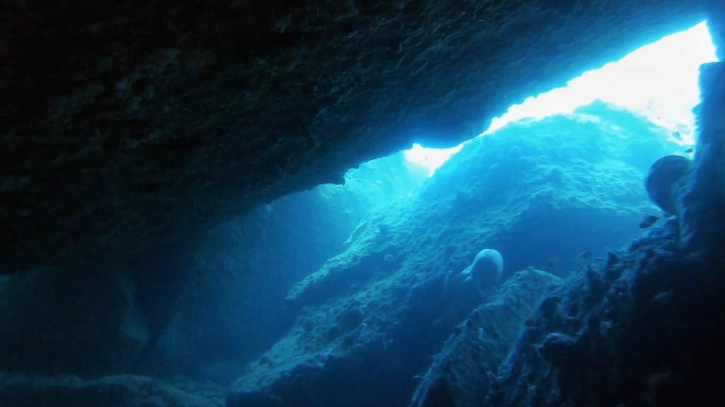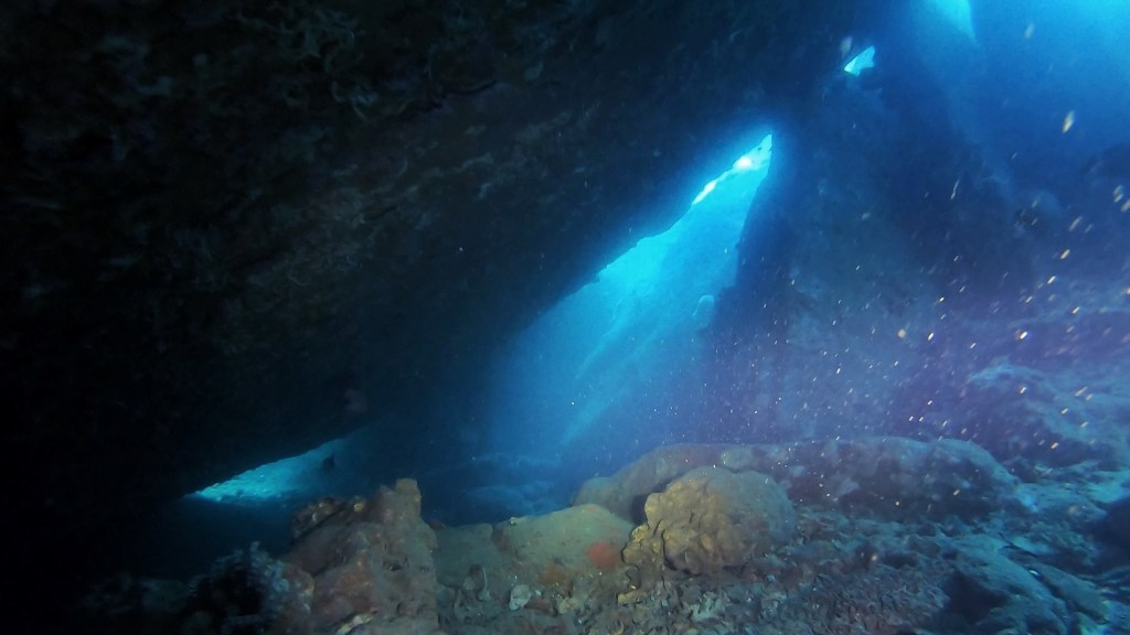Eventually I saw instructor Tom swimming north but further away from me. This made me feel like I was close and then I saw a big black shadow on some rocks, that looked like the entrance to a cave. I dove closer and closer and then finally saw the light from one of the 3 exits of the swim through.