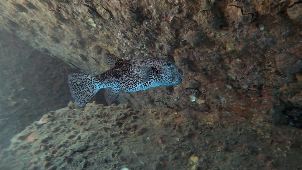 On the first swim through we saw a beautiful giant puffer fish was chilling inside it.