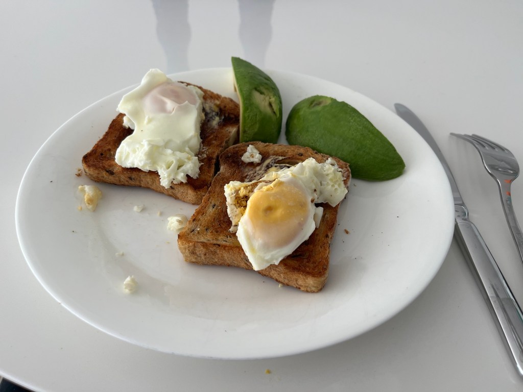 Sam was up and about this morning too so he whipped us up one of my favorite breakfasts, avocado toast with fried eggs.