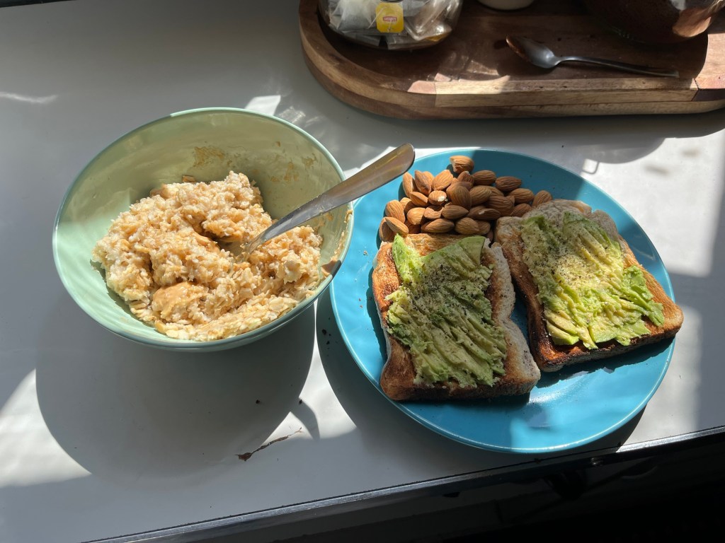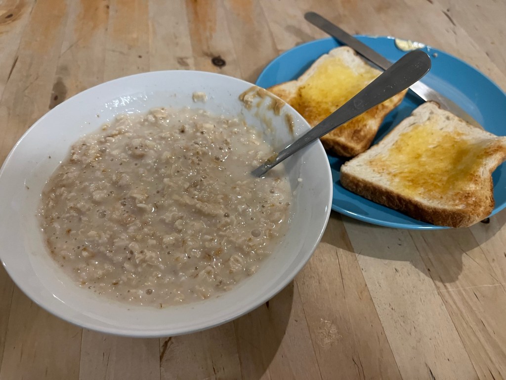 I made myself a quick bowl of oats with honey, peanut butter, and cinnamon sugar and two pieces of toast. And around that time, Lewis joined us as well.