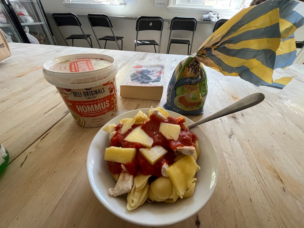 When I came back down stairs, I decided it was time for lunch. So I made myself some leftover pasta and of course devoured a lot of hummus.