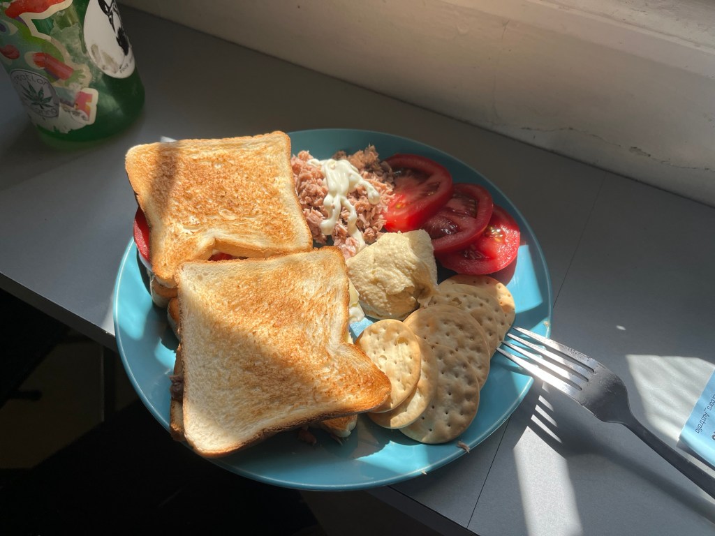 I eventually went and made myself lunch. I had a couple tuna sandwiches and of course hummus! I’m so happy I’ve found such a cheap tub of hummus. It’s one of my favorite foods.