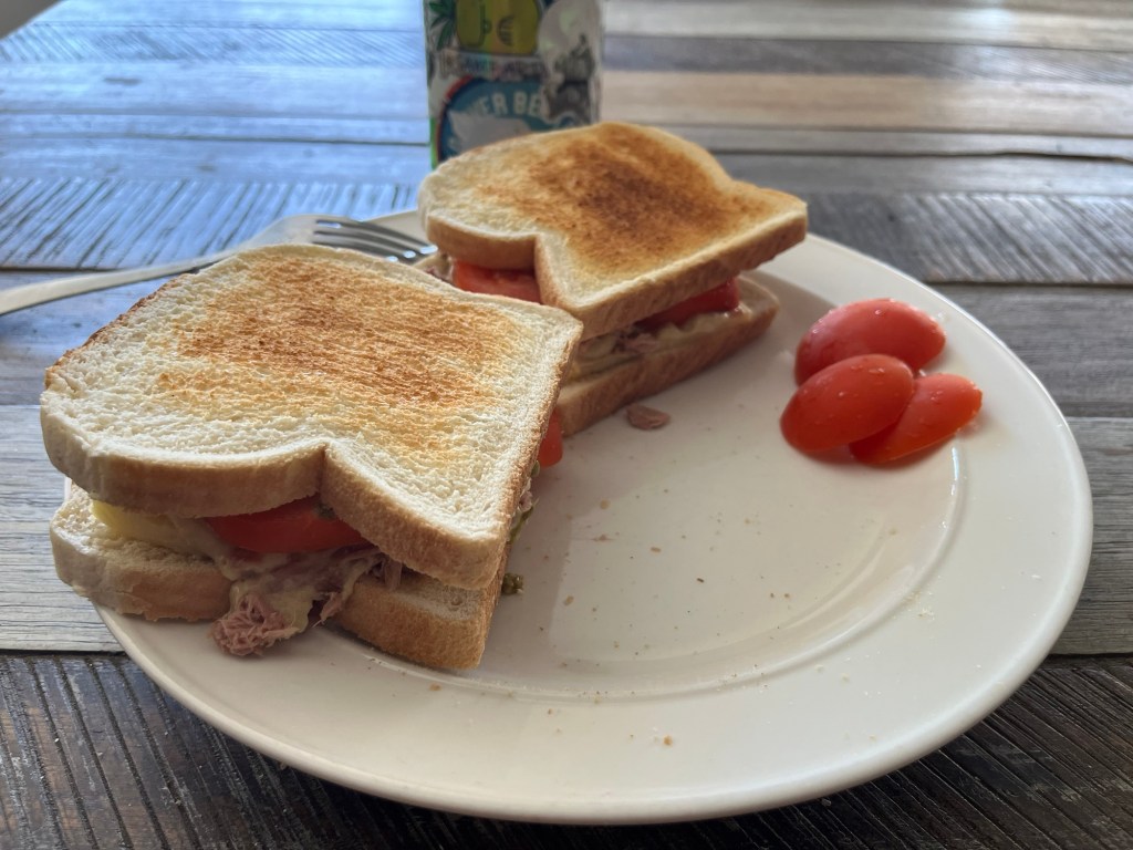 I whipped up a quick, but tasty tuna sandwich. I put hummus, cheese, pesto, and tomato’s on it which made it insanely scrumptious.