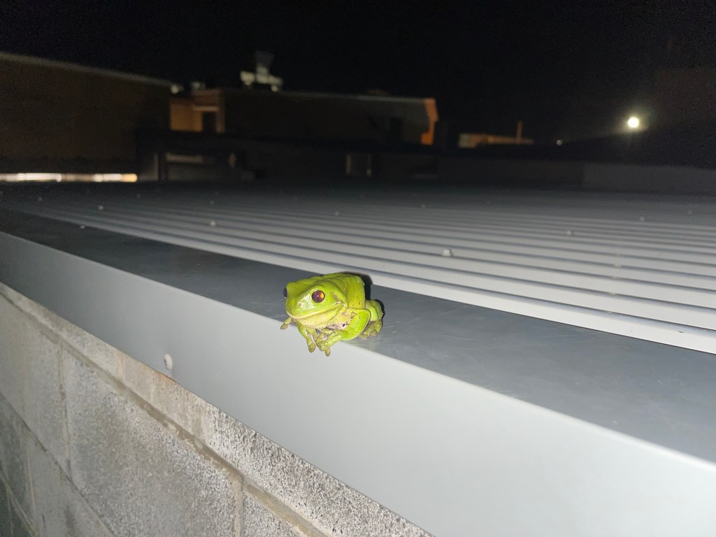 We finished our drinks and Will and I walked home and chatted more in the way. As I walked up the stairs to my place, I saw a shadow of a big critter. I took a picture and found myself staring at a very large green frog!