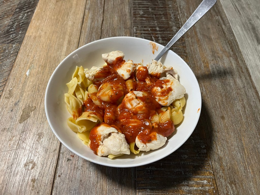 I cooked up some more chicken and had leftover noodles and sauce. But when I finished I was still hungry… but I was out of snacks, I definitely need a grocery store run on the sooner side.