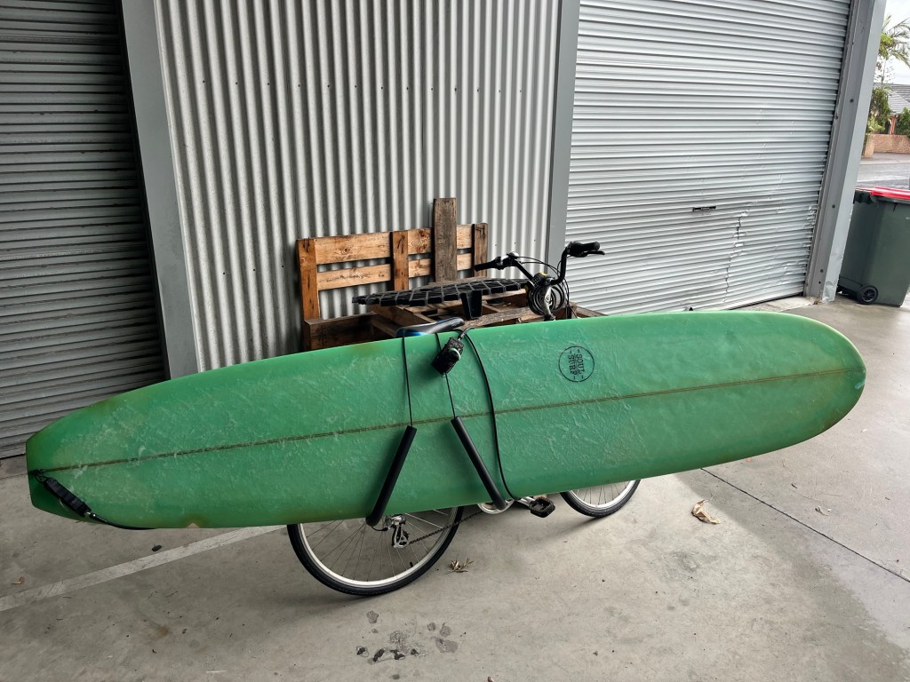 I then set off home on my bike which is when I started running into issues… the bike holder started shifting a bunch and the prongs holding the surfboard were moving causing the board to wobble a lot. So I had to hold the board while I biked to make sure it didn’t hit my back wheel or the ground… also with the wind picking up, it made the ride a bit sketchy.