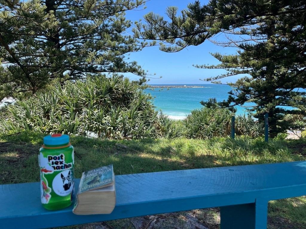 I went about my morning as usual. I started with reading in my bed, but then decided to take my new chair for a spin and head up the hill to read in the sun overlooking the beach.