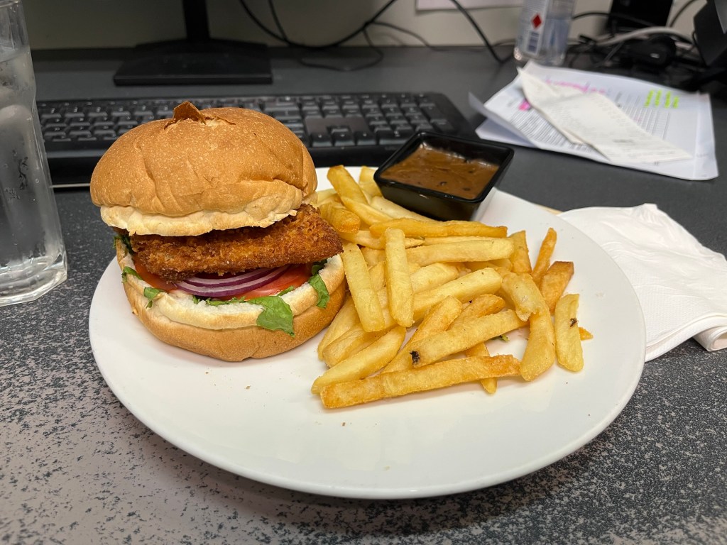 I was able to sneak a break in around 9:30pm again. My manager had ordered a fish burger, but since we were so busy, he just gave it to me since he wasn’t going to be taking a break anytime soon. And I wasn’t going to say no to a free meal!