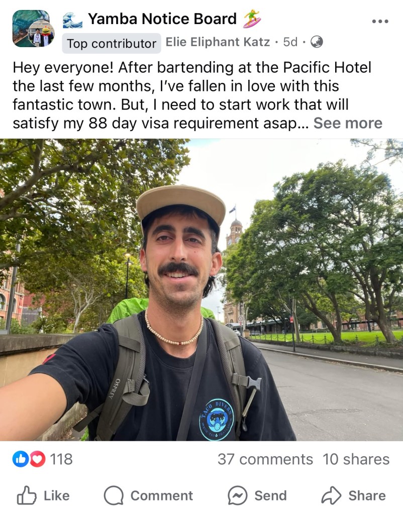 I ended off last week posting a “cry for help” to the Yamba notice board Facebook group. I needed to find work that would fulfill my 88 day visa requirement ASAP. It ended up being very well received and the community went to bat for me! There were a number of people commenting potential job opportunities, liking my post, and sharing it too!