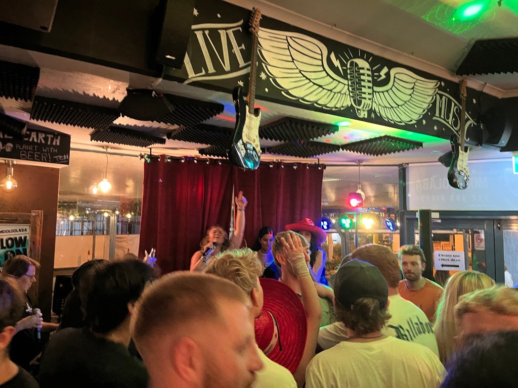Unfortunately, I jammed one of my fingers fairly hard while swimming this time… but the sunset was gorgeous! We went back to the hostel to shower and have dinner, which tonight was a free sausage sizzle! And then, after a few more games of pool, a large group of us headed to Taps Bar for karaoke night.
