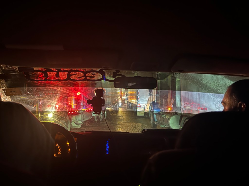 At one point we were driving on the sidewalk and another point we were squeezing through the smallest gaps between the semi trucks.