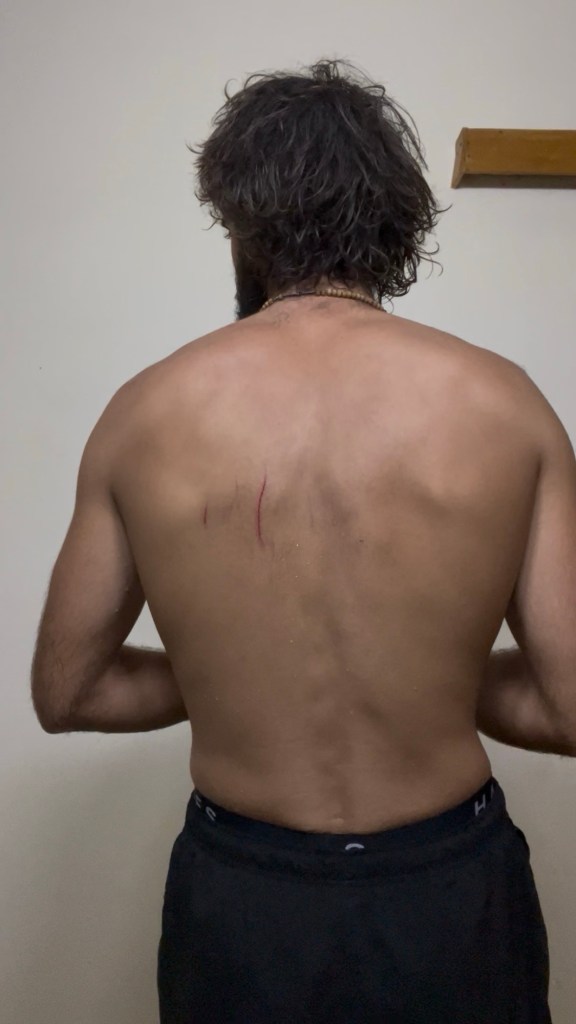 On my walk to the beach I accidentally stood up too quickly when ducking under a tree that had fallen across the path to the beach. I had scraped my back but didn’t know how badly until I got back to the hostel.