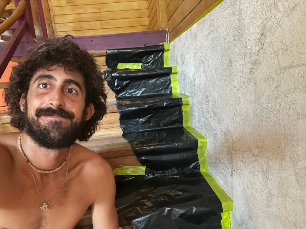 Today’s job was to tape and lay plastic sheets in the dorms of the main building and then start painting the walls. When I first arrived at the hostel, the first day of work I had was scrubbing the walls of these dorm rooms. The rust from the ceiling fans had stained the walls and we couldn’t scrub it out, so it was time to paint over them.