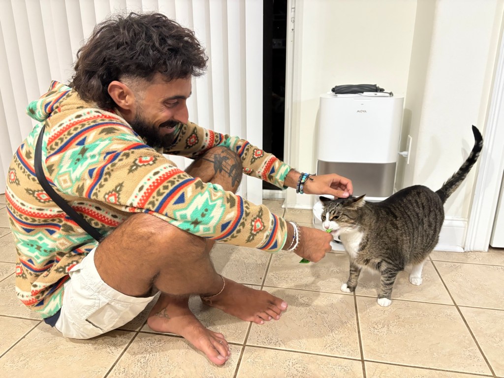 When we got back home, I gave a treat to their cat Gizmo and he finally let me pet him! Even a bit afterwards he was coming over to me to let me pet him… he even wanted to play for a little bit. But then the love wore off not long after. We’re making strides though!