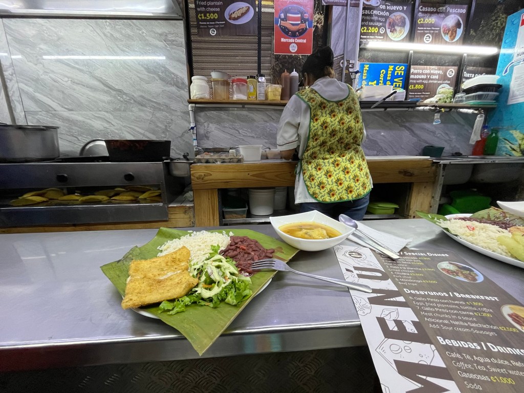 We arrived at the central market and walked through the labyrinth of the hectic market. We had heard there was cheap food here and were determined to find the cheapest traditional Costa Rican meal we could. After checking menu after menu, we found a meal for 2000 colones! We were the only non-Costa Rican’s at the little restaurant so we knew we hit the right spot.